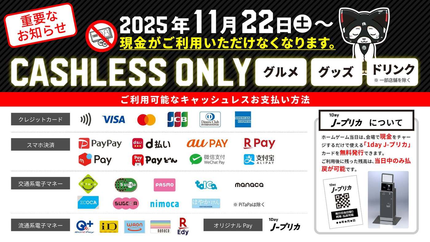 2025年11月22日(土)より、The Rebs Store(グッズ売店) / レブグル(キッチンカー) / ドリンクブースのお支払いにおきまして、キャッシュレス決済のみのご利用とさせていただくことが決定いたしました。