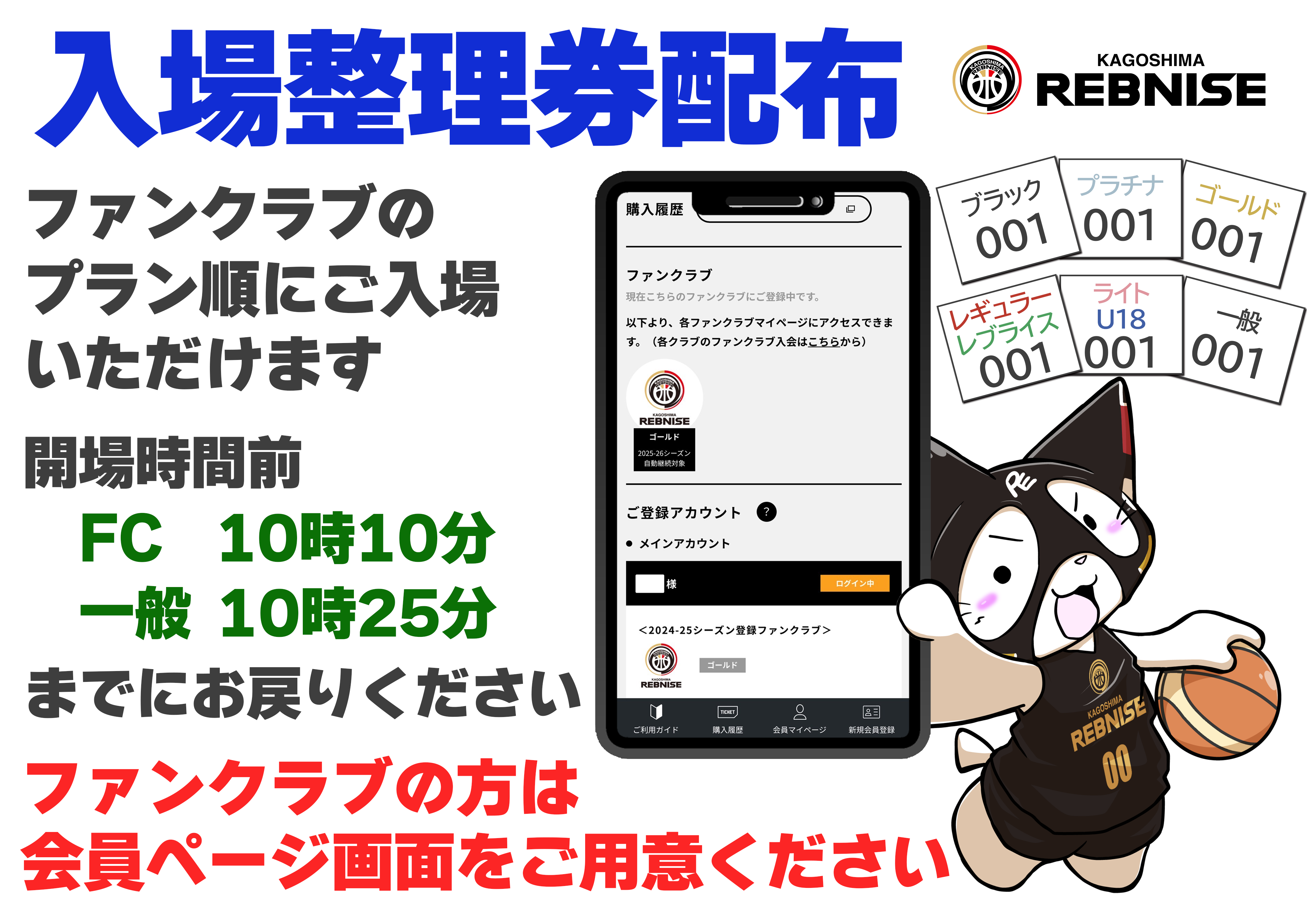 - プレシーズンゲームの先行入場はファンクラブプラン順とさせていただきます。入場口で”ファンクラブ会員ページ”をご提示いただき、整理券を配布します。