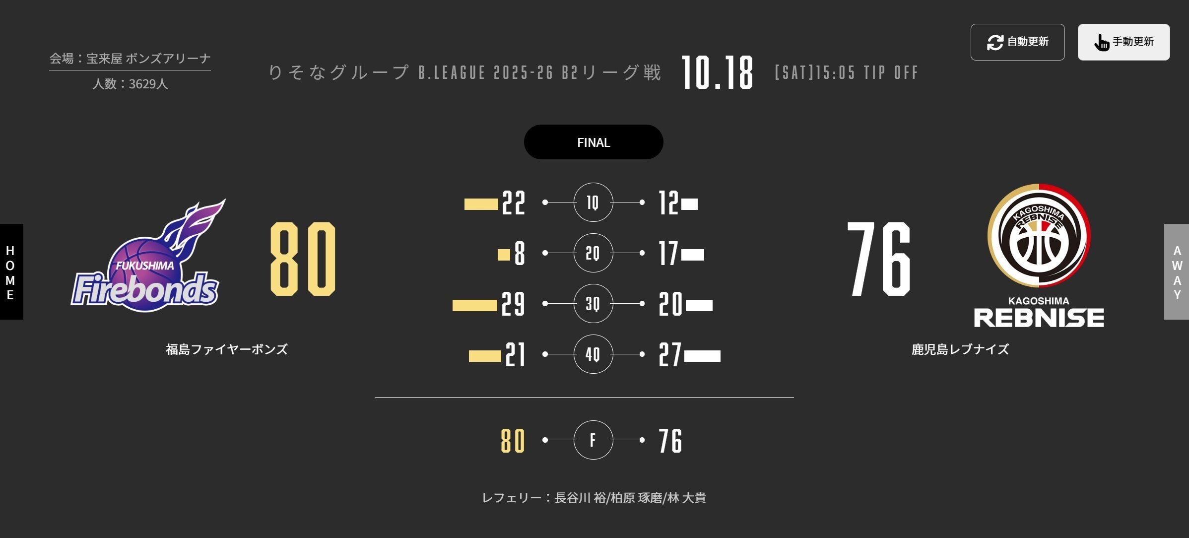 本日(10/18)、りそなグループ B.LEAGUE 2025-26シーズン 第4節 AWAY 宝来屋ボンズアリーナで福島ファイヤーボンズと対戦しました。試合結果をお知らせします。