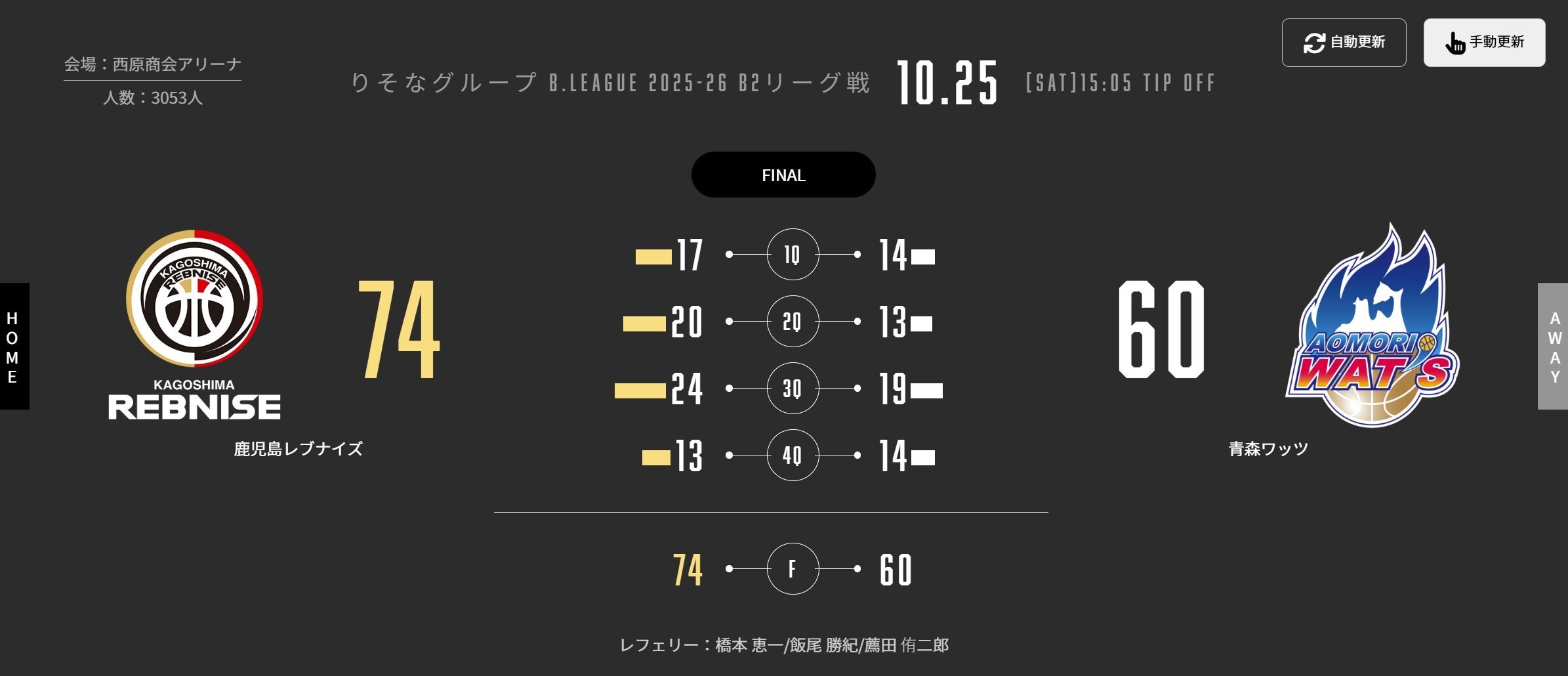 本日(10/25)、りそなグループ B.LEAGUE 2025-26シーズン 第5節 西原商会アリーナで青森ワッツと対戦しました。試合結果をお知らせします。