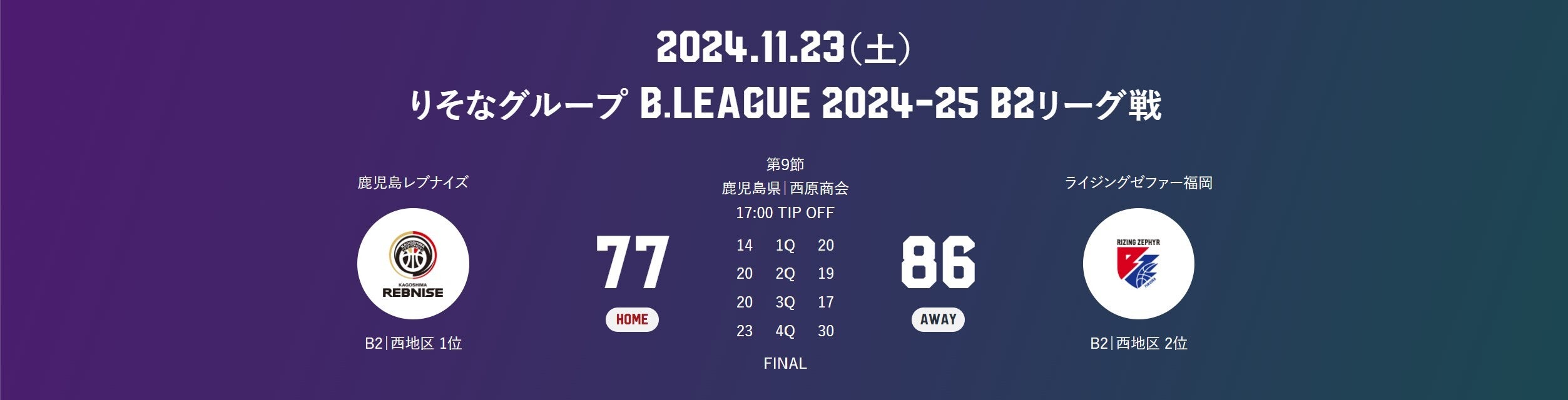 本日(11/23)、りそなグループ B.LEAGUE 2024-25シーズン 第9節 GAME1 ライジングゼファー福岡と対戦しました。試合結果をお知らせします。