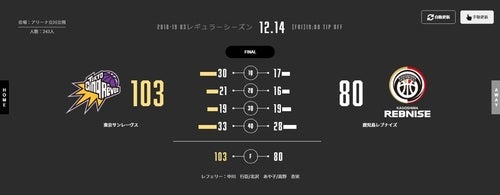 12/14(金)レギュラーシーズン 第5節 vs東京サンレーヴス 試合結果