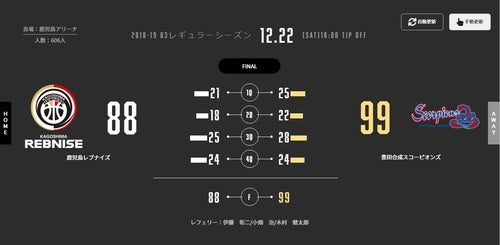 12/22(土)レギュラーシーズン 第6節 vs豊田合成スコーピオンズ 試合結果