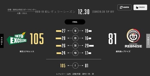 12/30(日)レギュラーシーズン 第7節 vs東京エクセレンス 試合結果