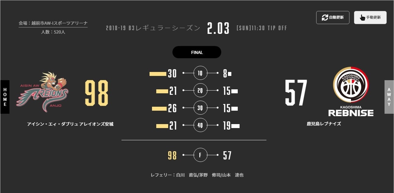 2/3(日)レギュラーシーズン 第12節 vsアイシンAW 試合結果