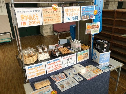温泉蒸し卵、芋かりんとう、ミネラルウオーター、たんかんジュース、岩塩(料理用と入浴用)など