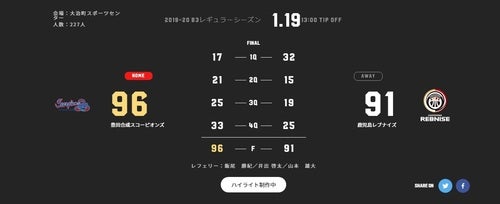 1/19(日) 第16節 vs豊田合成スコーピオンズ 試合結果