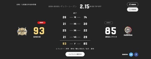 2/15(土) 第20節 vs金沢武士団 試合結果
