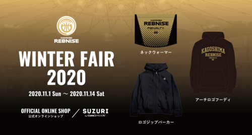 この度鹿児島レブナイズでは、公式オンラインショップ並びに公式SUZURIショップにて2020年11月1日(日)より「鹿児島レブナイズ WINTER FAIR 2020」と題し、新商品の発売、一部商品は~2020年11月14日(土)までセールを行います。