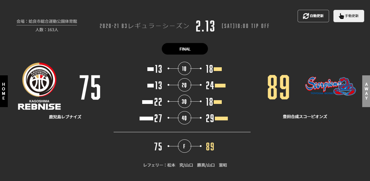 本日(2/13)、B3リーグ 2020-21シーズン 第6節 姶良市総合運動公園体育館で豊田合成スコーピオンズと対戦いたしました。