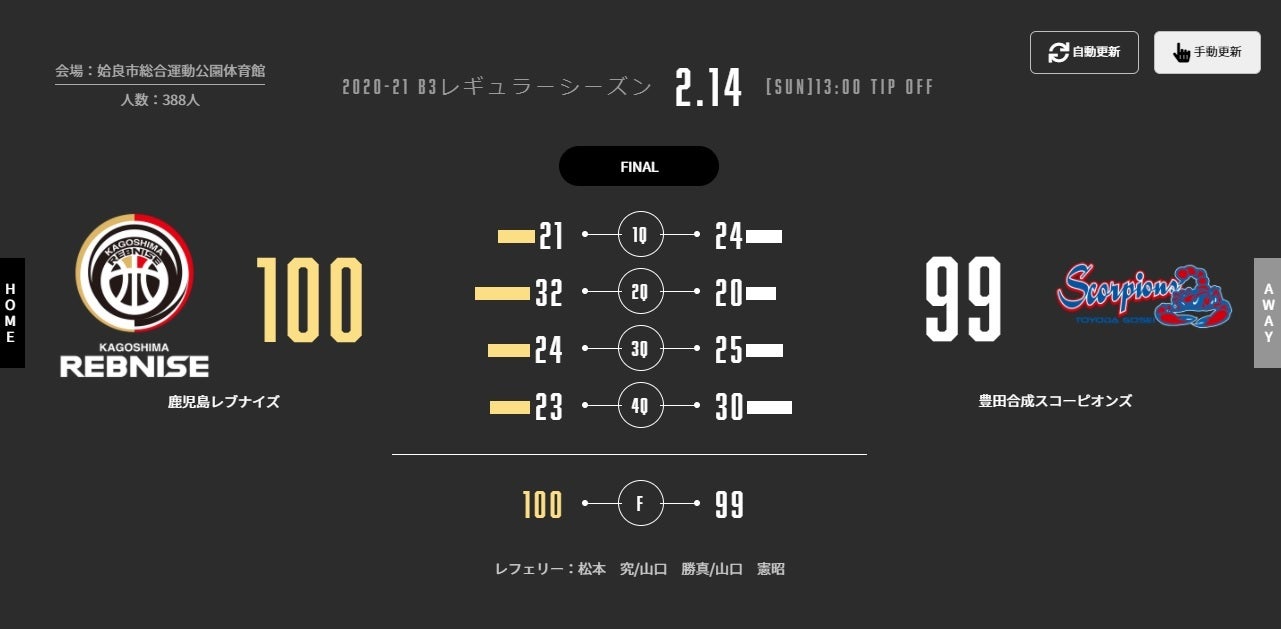 本日(2/14)、B3リーグ 2020-21シーズン 第6節 姶良市総合運動公園体育館で豊田合成スコーピオンズと対戦いたしました。