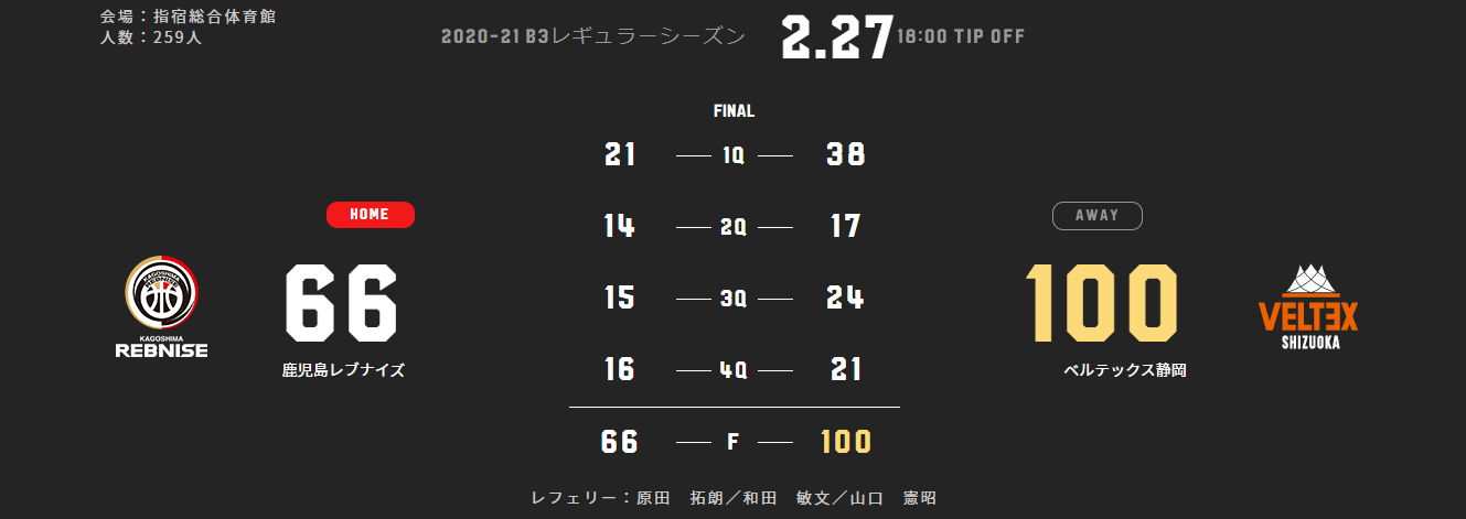 本日(2/27)、B3リーグ 2020-21シーズン 第8節 指宿総合体育館でベルテックス静岡と対戦いたしました。