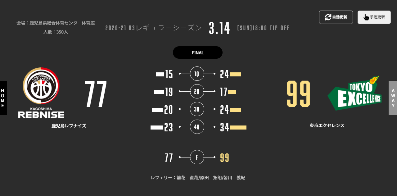本日(3/14)、B3リーグ 2020-21シーズン 第10節 鹿児島県総合体育センター体育館で東京エクセレンスと対戦いたしました。