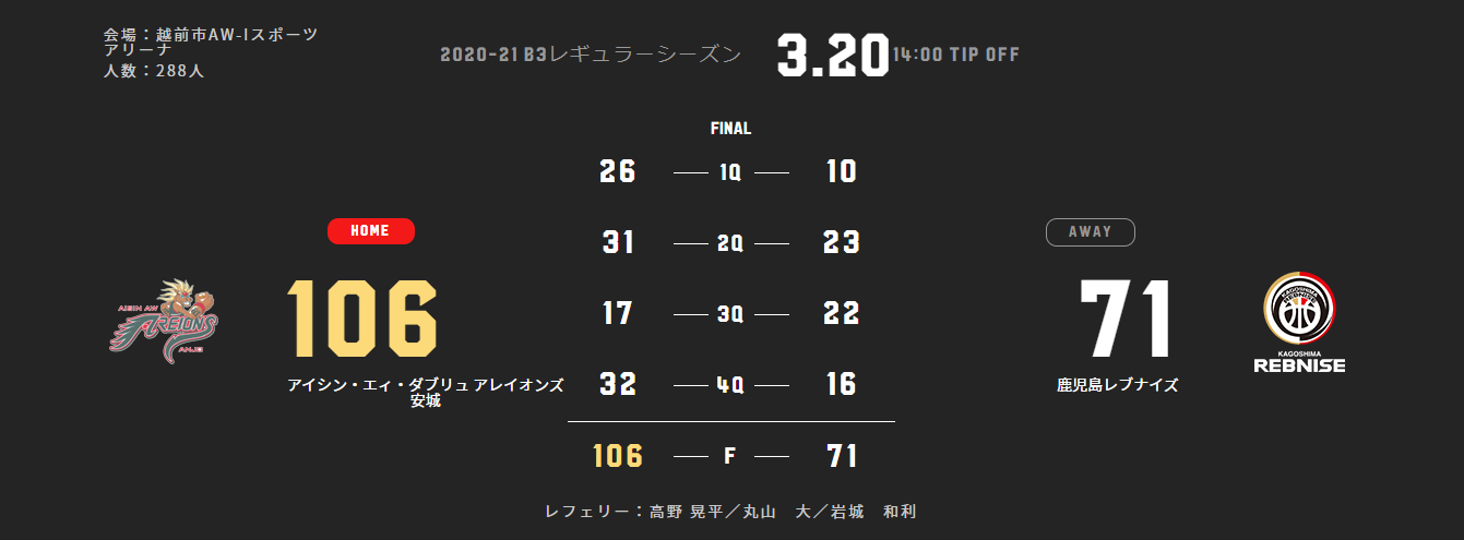 本日(3/20)、B3リーグ 2020-21シーズン 第11節 AWAY 越前市AW‐I スポーツアリーナでアイシン・エィ・ダブリュ アレイオンズ安城と対戦いたしました。