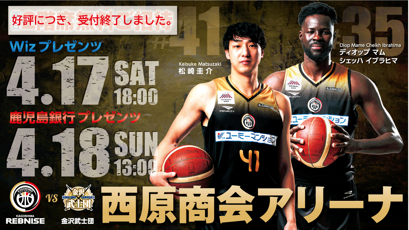 【随時更新】4/17(土)Wizプレゼンツ、18(日)鹿児島銀行プレゼンツ 試合情報 ※2階席無料ご招待受付終了