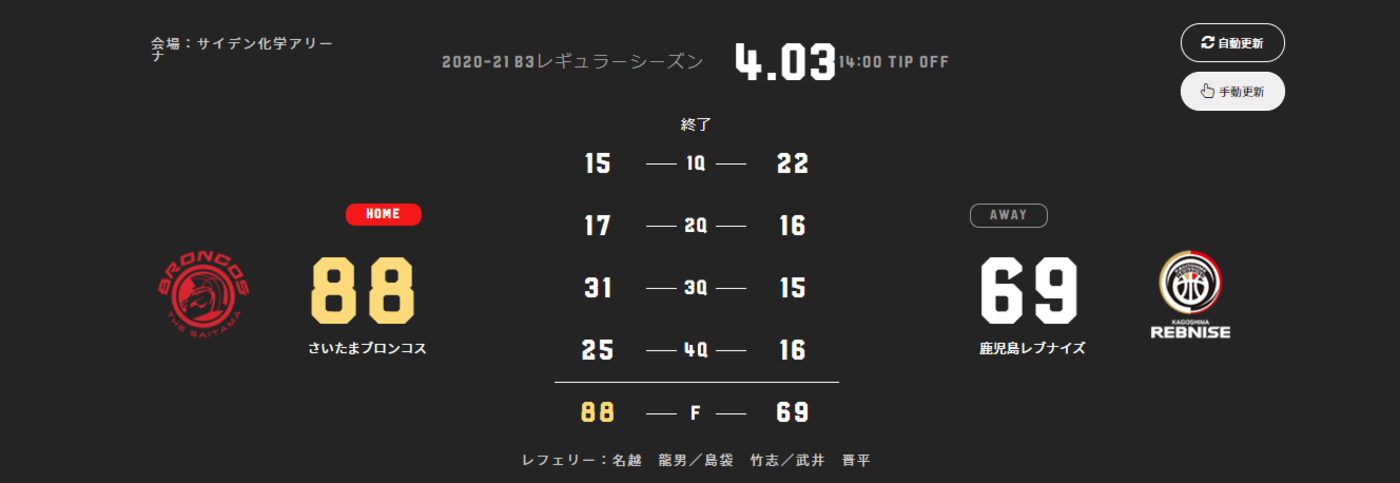 本日(4/3)、B3リーグ 2020-21シーズン 第13節 AWAY サイデン化学アリーナでさいたまブロンコスと対戦いたしました。