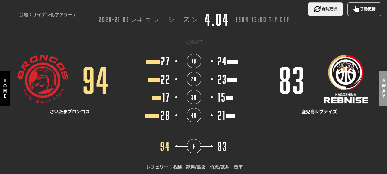 本日(4/4)、B3リーグ 2020-21シーズン 第13節 AWAY サイデン化学アリーナでさいたまブロンコスと対戦いたしました。
