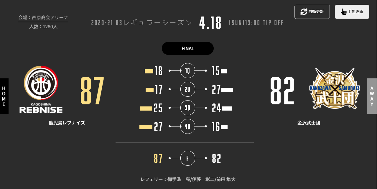 WIN!WIN!WIN!4/18(日) 第15節 vs金沢武士団 試合結果