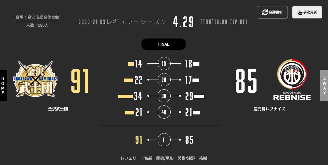 本日(4/29)、B3リーグ 2020-21シーズン 第17節 AWAY金沢市総合体育館で金沢武士団と対戦いたしました。