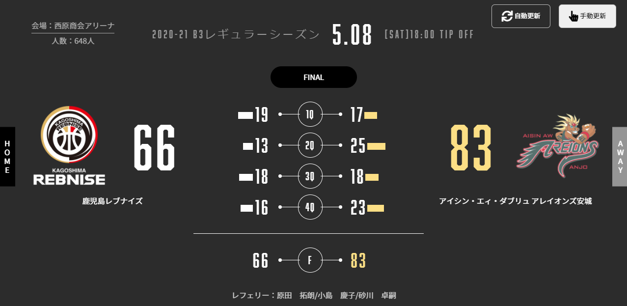 本日(5/8)、B3リーグ 2020-21シーズン 第19節 西原商会アリーナでアイシン・エィ・ダブリュ アレイオンズ安城と対戦いたしました。
