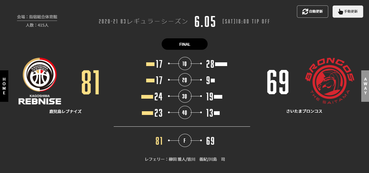 本日(6/5)、B3リーグ 2020-21シーズン 最終戦 第23節 指宿総合体育館で埼玉ブロンコスと対戦いたしました。