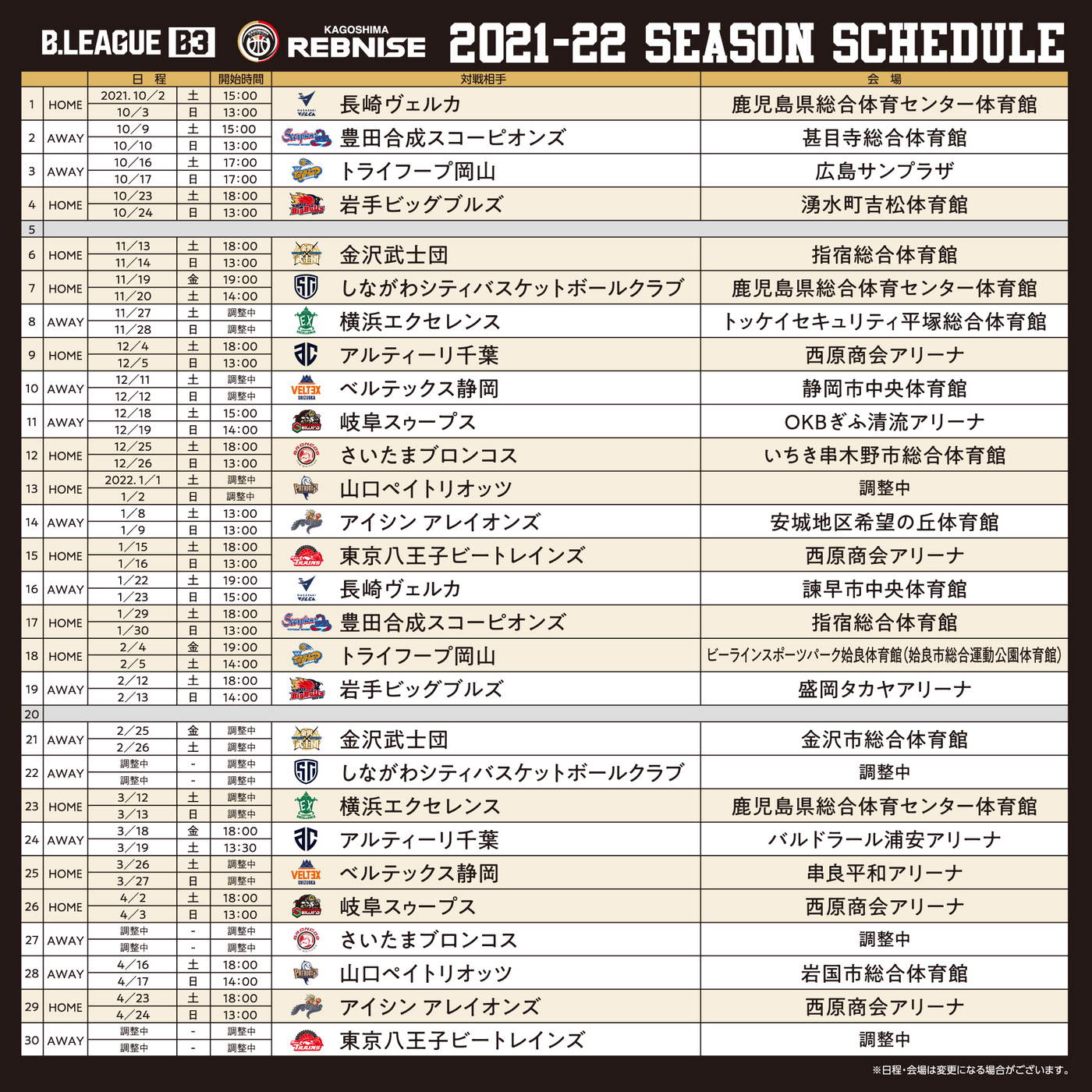 この度、鹿児島レブナイズでは、第2節(AWAY)がリモートゲームに、第8節(AWAY)の試合会場及び第24節(AWAY)試合開始時刻が決定いたしましたのでお知らせいたします。