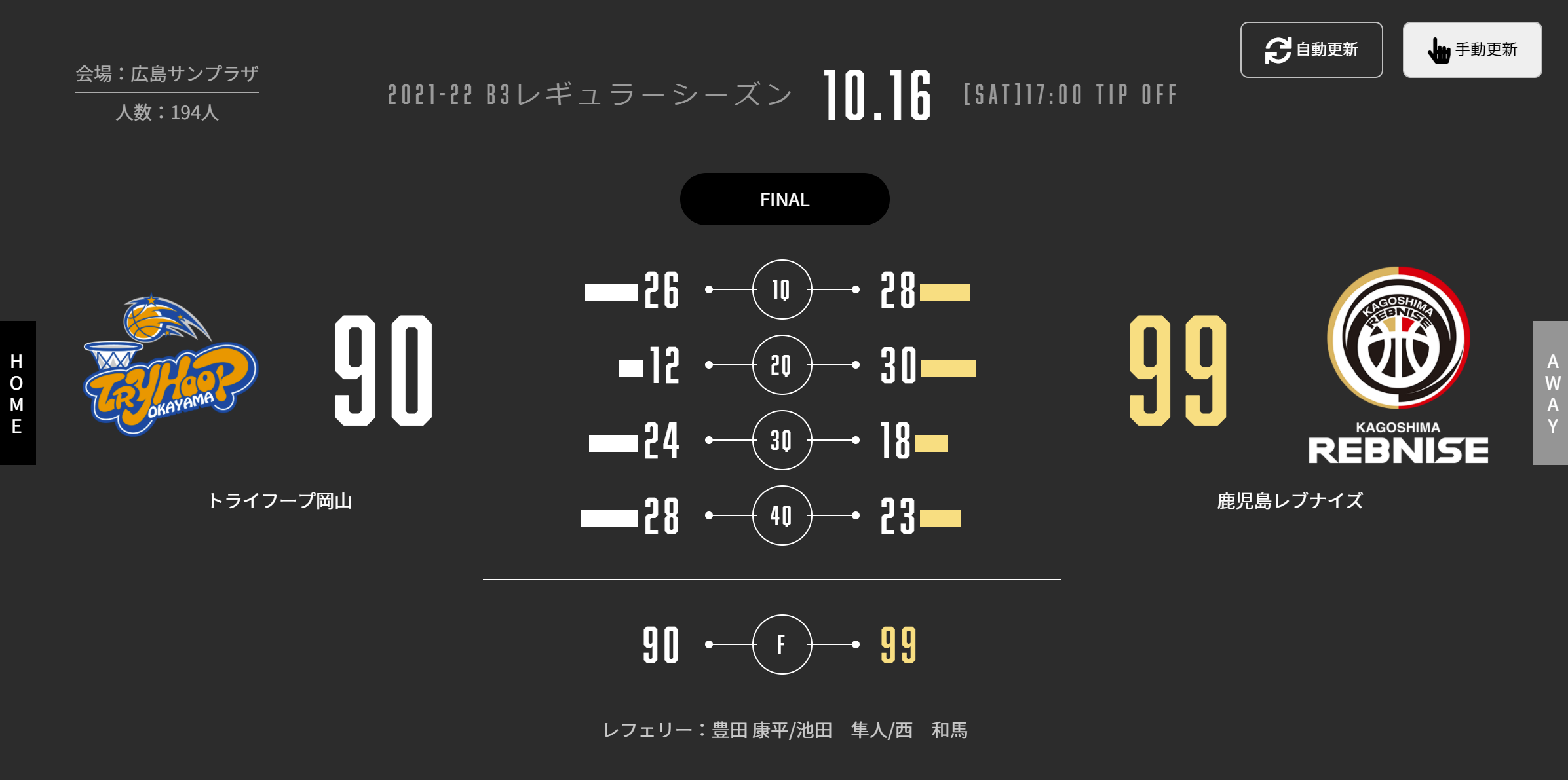 本日(10/16)、B3リーグ 2021-22シーズン 第3節 AWAY 広島サンプラザでトライフープ岡山と対戦いたしました。試合結果をお知らせします。
