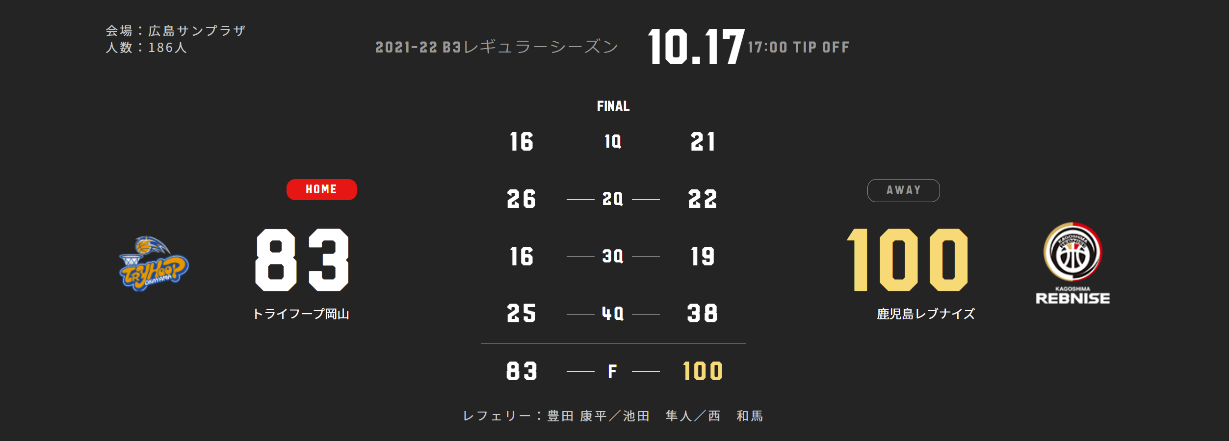 本日(10/17)、B3リーグ 2021-22シーズン 第4節 AWAY 広島サンプラザでトライフープ岡山と対戦いたしました。試合結果をお知らせします。