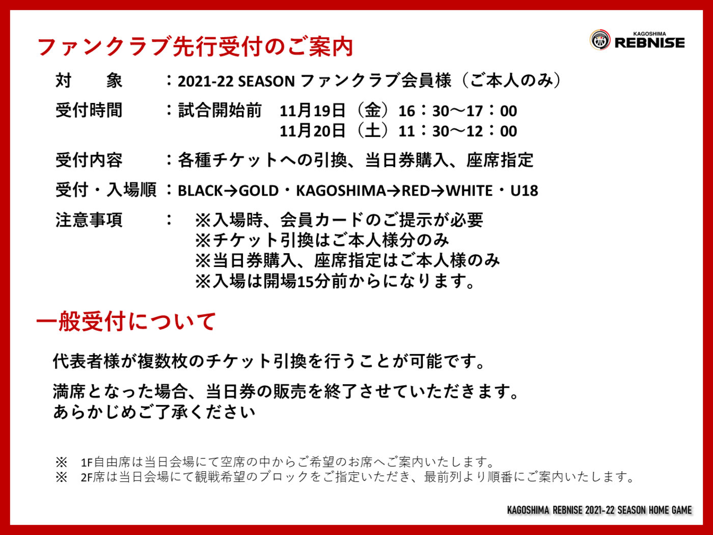 ※1F・2F席はご購入されたブロックにおいて先着順に前からご案内いたします。特定のお席をお選びいただくことはできません。