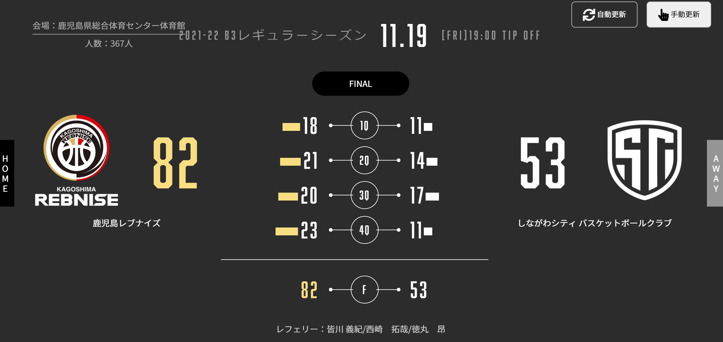 本日(11/19)、B3リーグ 2021-22シーズン 第7節 鹿児島県総合体育センター体育館でしながわシティバスケットボールクラブと対戦いたしました。