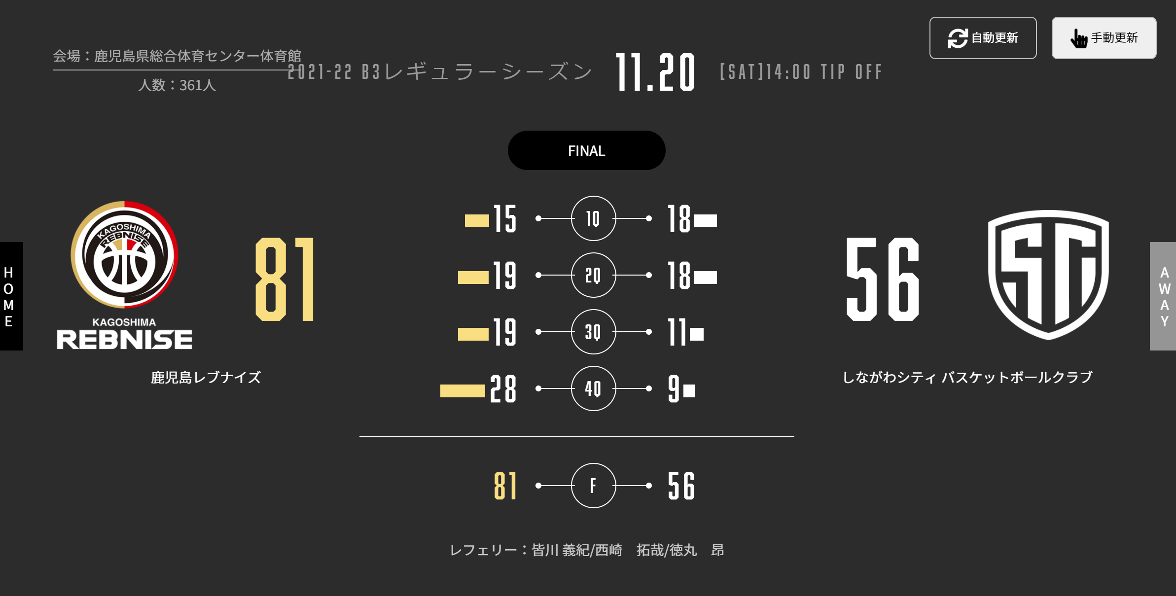 本日(11/20)、B3リーグ 2021-22シーズン 第7節 鹿児島県総合体育センター体育館でしながわシティバスケットボールクラブと対戦いたしました。