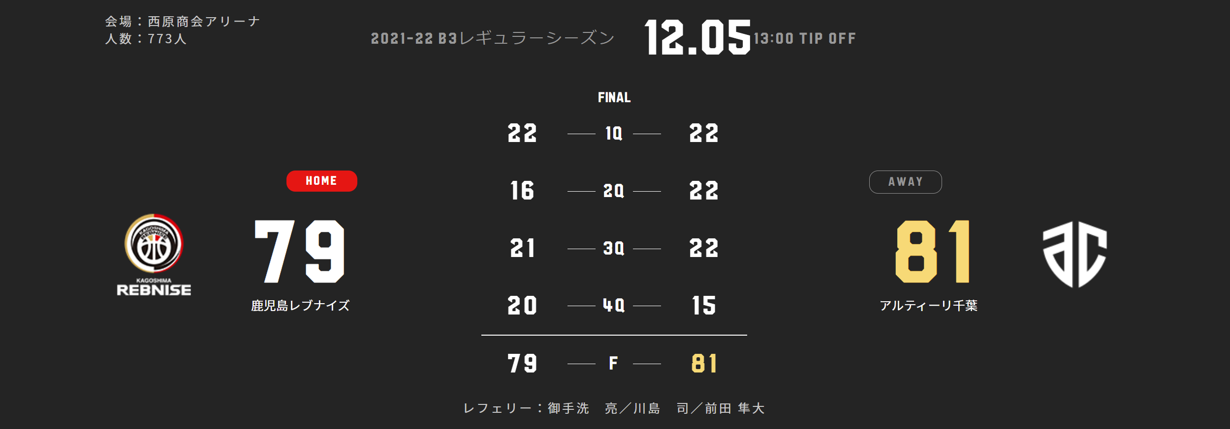 本日(12/5)、B3リーグ 2021-22シーズン 第9節 西原商会アリーナでアルティーリ千葉と対戦いたしました。
