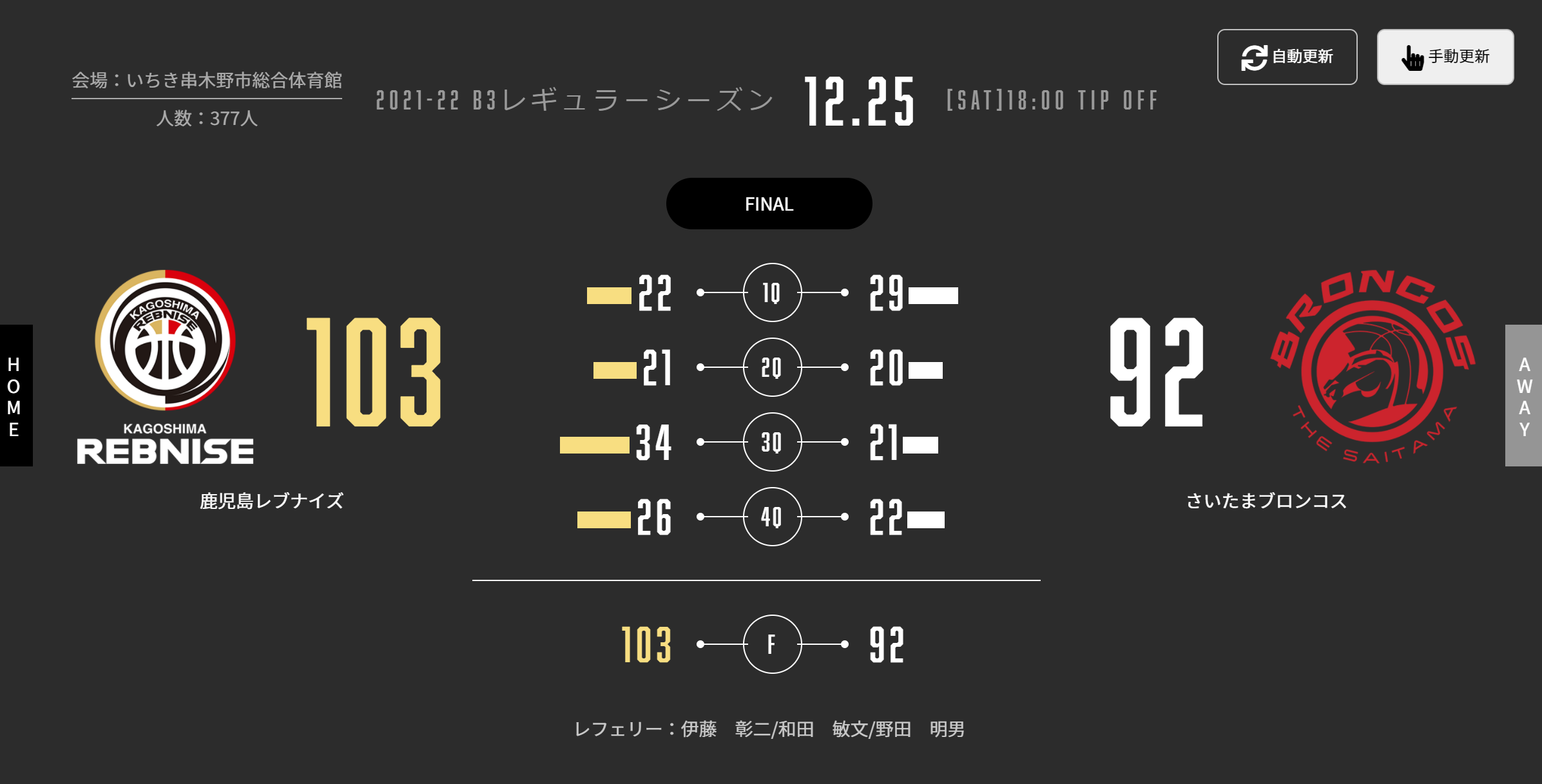 本日(12/25)、B3リーグ 2021-22シーズン 第12節 いちき串木野市総合体育館でさいたまブロンコスと対戦いたしました。