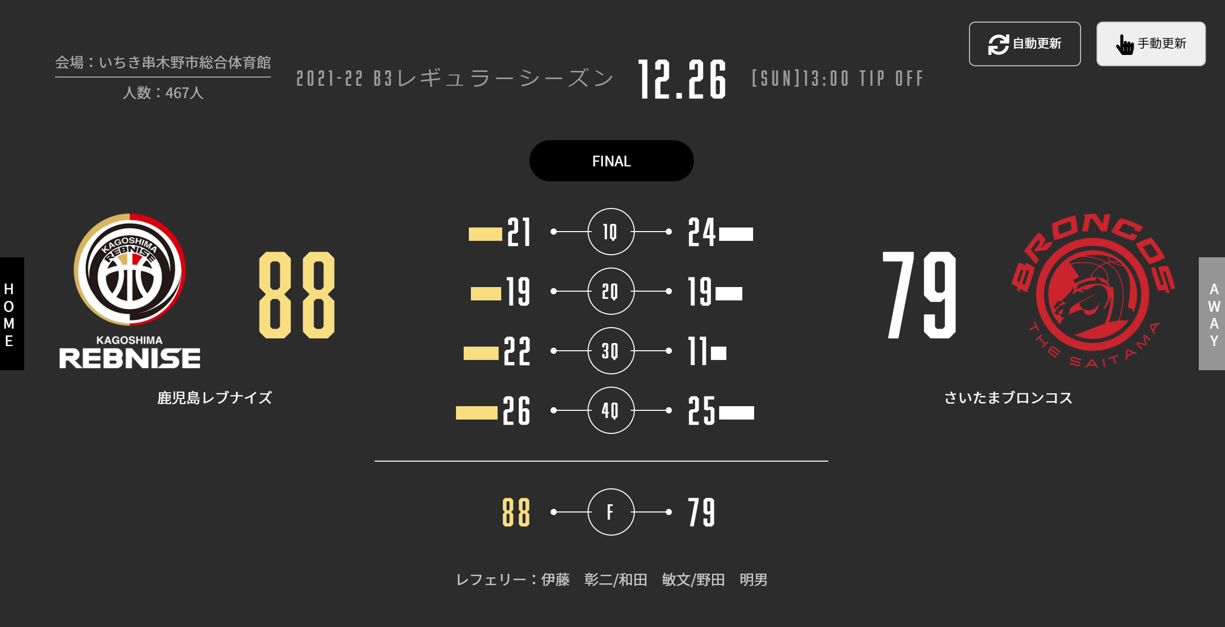 本日(12/26)、B3リーグ 2021-22シーズン 第12節 いちき串木野市総合体育館でさいたまブロンコスと対戦いたしました。