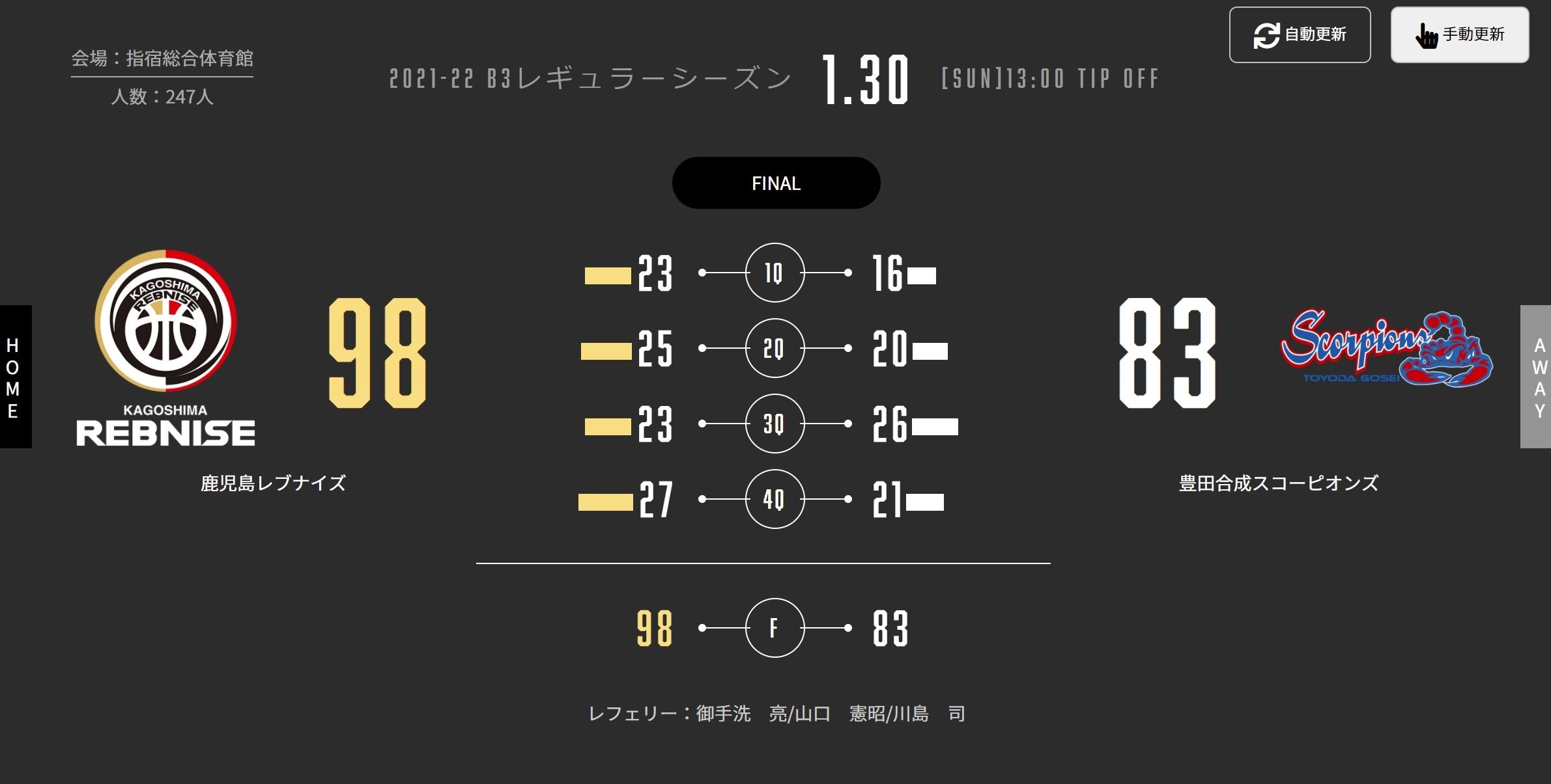 本日(1/30)、B3リーグ 2021-22シーズン 第17節 指宿総合体育館で豊田合成スコーピオンズと対戦いたしました。