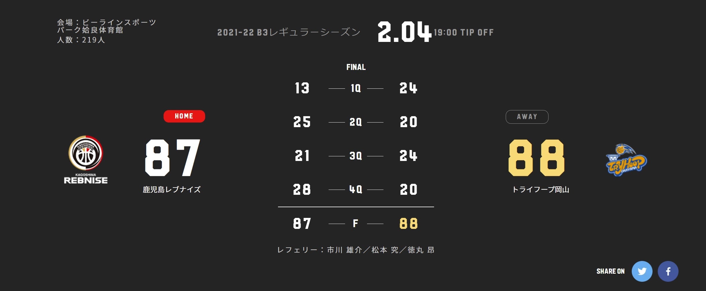 本日(2/4)、B3リーグ 2021-22シーズン 第18節 ビーラインスポーツパーク姶良体育館でトライフープ岡山と対戦いたしました。