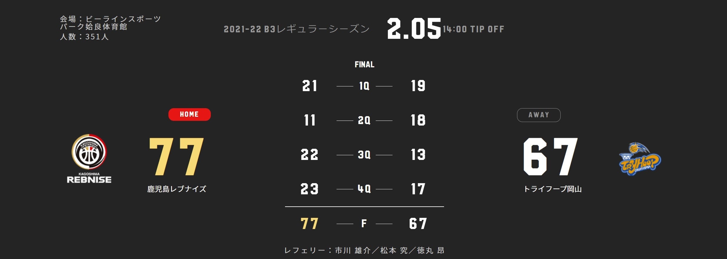 本日(2/5)、B3リーグ 2021-22シーズン 第18節 ビーラインスポーツパーク姶良体育館でトライフープ岡山と対戦いたしました。
