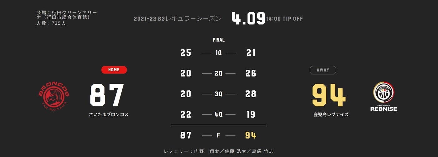 本日(4/9)、B3リーグ 2021-22シーズン 第27節 AWAY 行田グリーンアリーナでさいたまブロンコスと対戦いたしました。