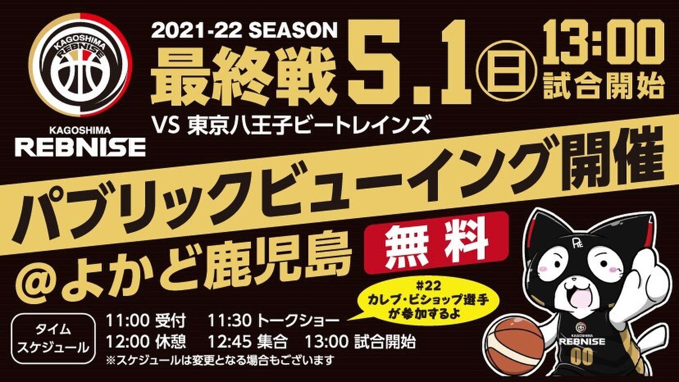 この度、鹿児島レブナイズでは5月1日(日)の最終戦、オフィシャルパートナーである鹿児島銀行様の『よかど鹿児島』にてパブリックビューイングを開催することとなりましたのでお知らせいたします。