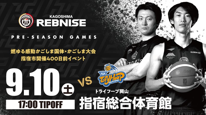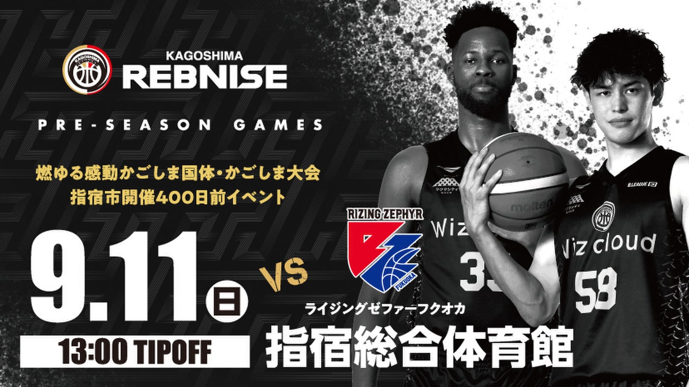この度、鹿児島レブナイズでは、9月11日(日)に、燃ゆる感動かごしま国体・かごしま大会指宿市開催400日前イベントとして指宿総合体育館でプレシーズンゲームを開催いたします。