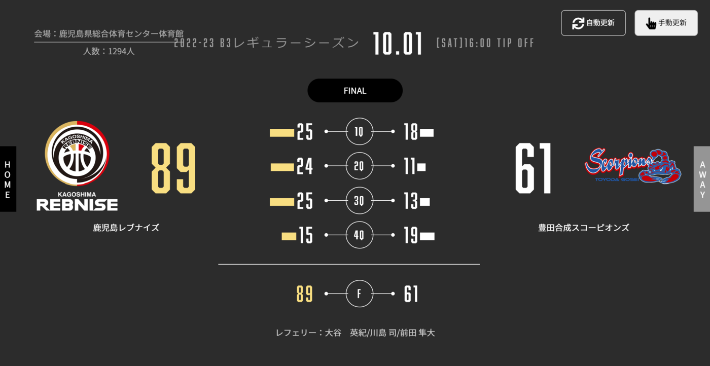 本日(10/1)、B3リーグ 2022-23シーズン 第1節 鹿児島県総合体育センター体育館で豊田合成スコーピオンズと対戦しました。試合結果をお知らせします。