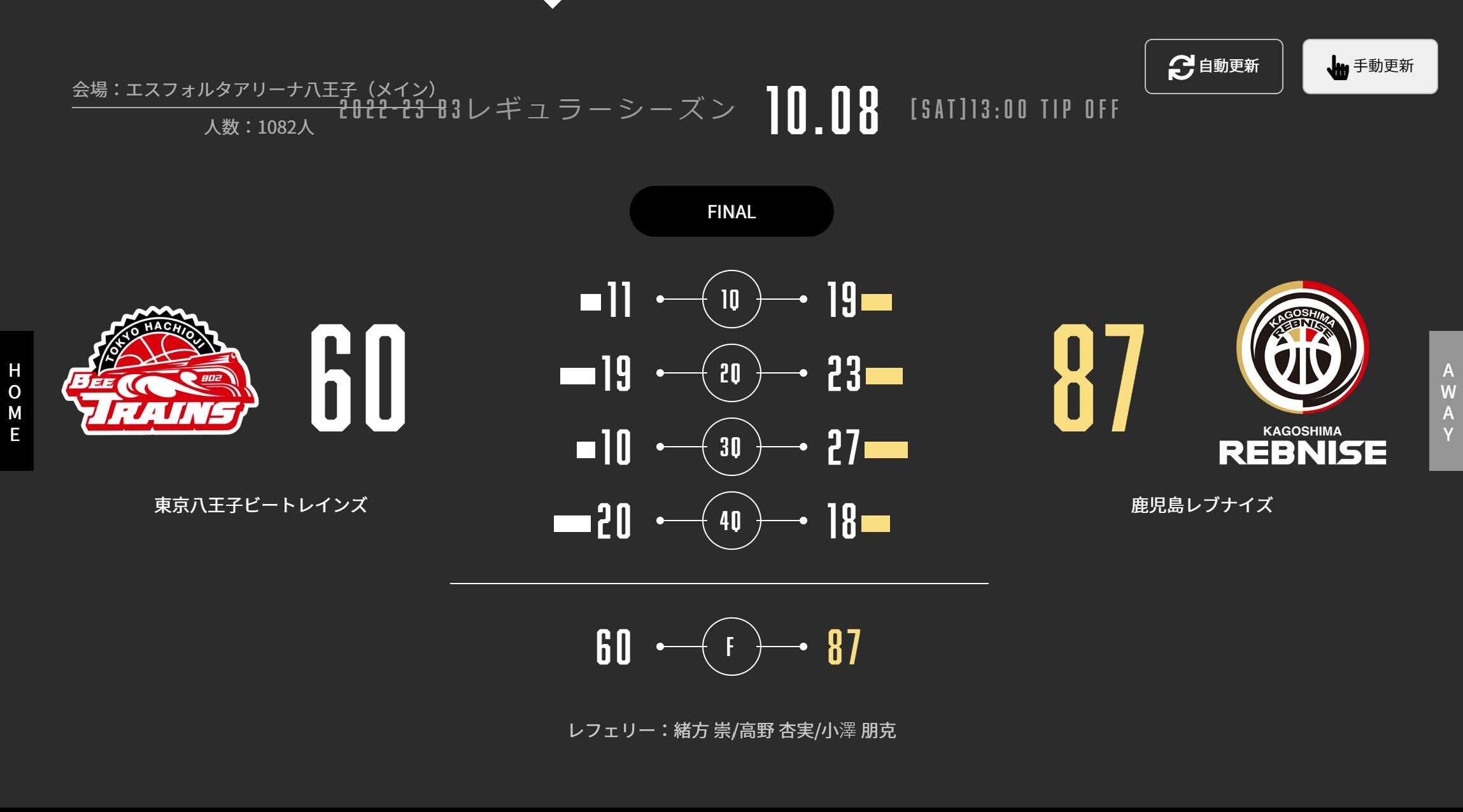 本日(10/8)、B3リーグ 2022-23シーズン 第2節 AWAY エスフォルタアリーナ八王子で東京八王子ビートレインズと対戦しました。試合結果をお知らせします。
