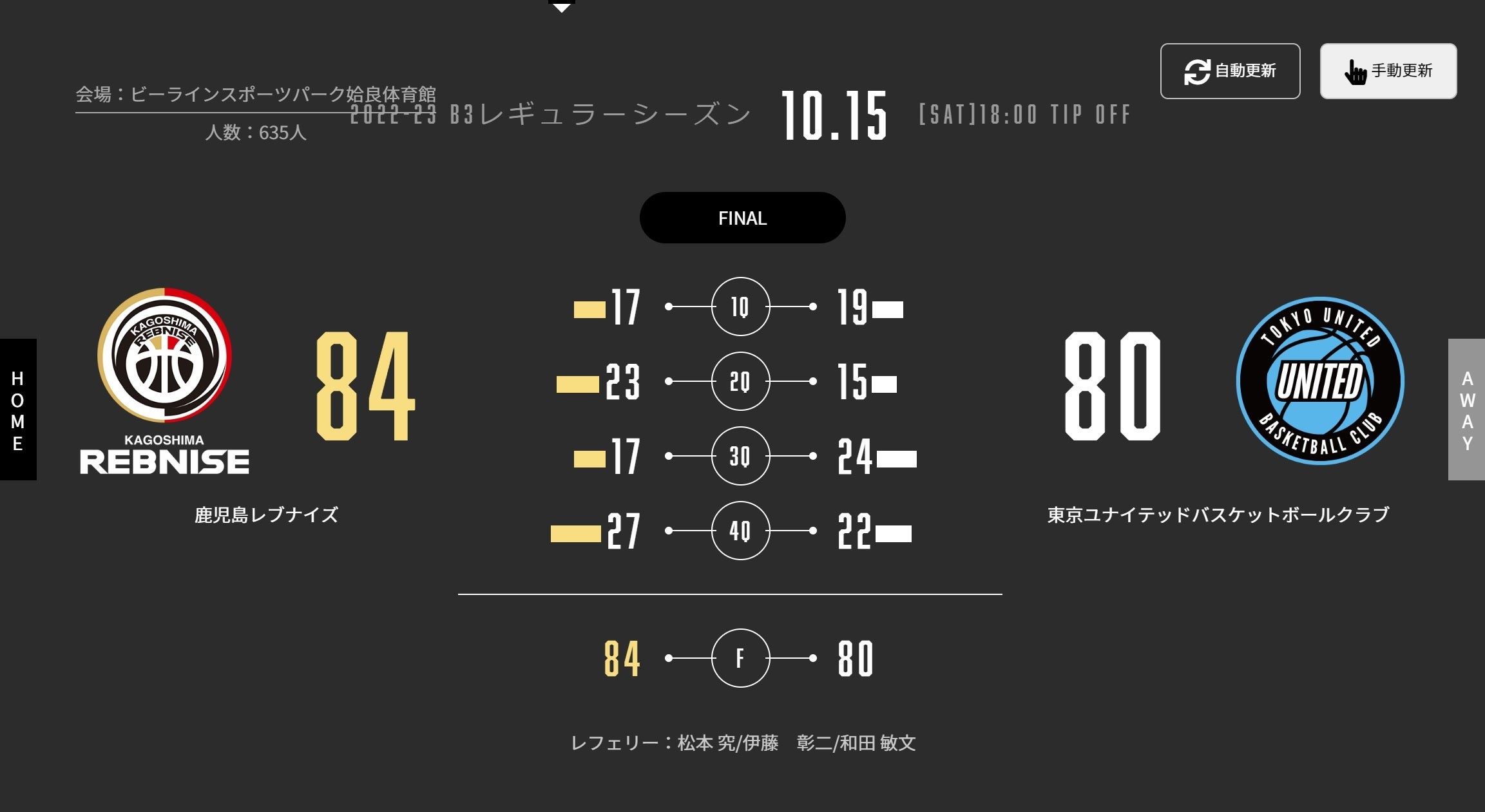本日(10/15)、B3リーグ 2022-23シーズン 第3節 ビーラインスポーツパーク姶良で東京ユナイテッドバスケットボールと対戦しました。試合結果をお知らせします。