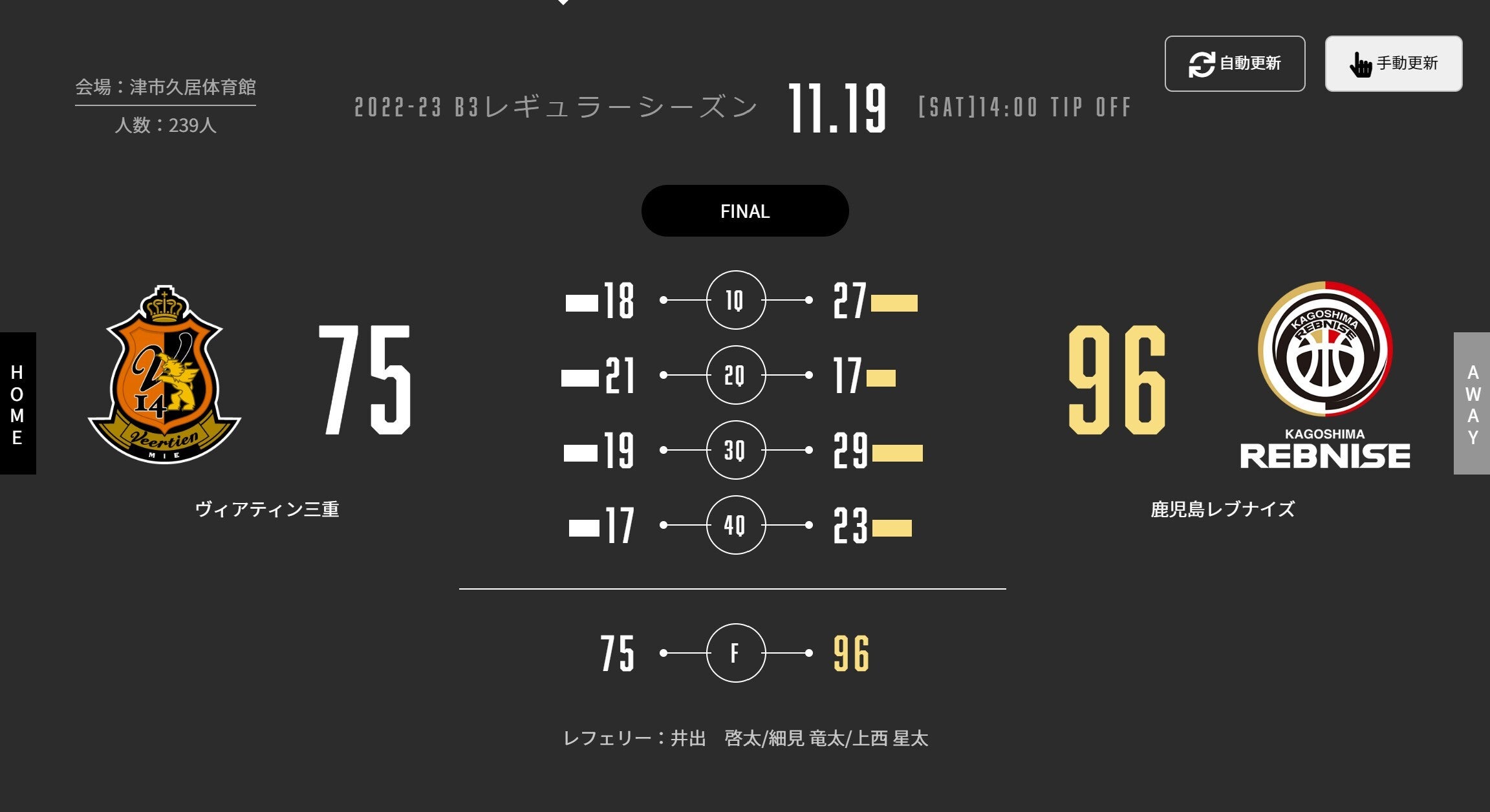 本日(11/19)、B3リーグ 2022-23シーズン 第7節 AWAY 津市久居体育館でヴィアティン三重と対戦しました。試合結果をお知らせします。