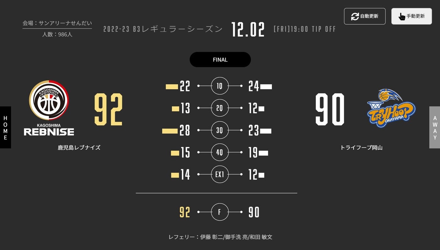 本日(12/2)、B3リーグ 2022-23シーズン 第9節 サンアリーナせんだいでトライフープ岡山と対戦しました。試合結果をお知らせします。
