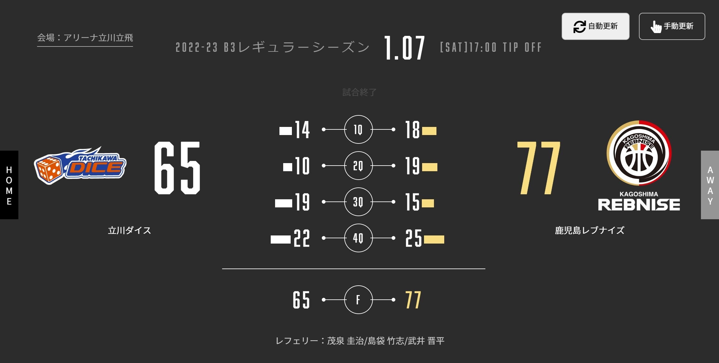 本日(1/7)、B3リーグ 2022-23シーズン 第13節 AWAYアリーナ立川立飛で立川ダイスと対戦しました。試合結果をお知らせします。