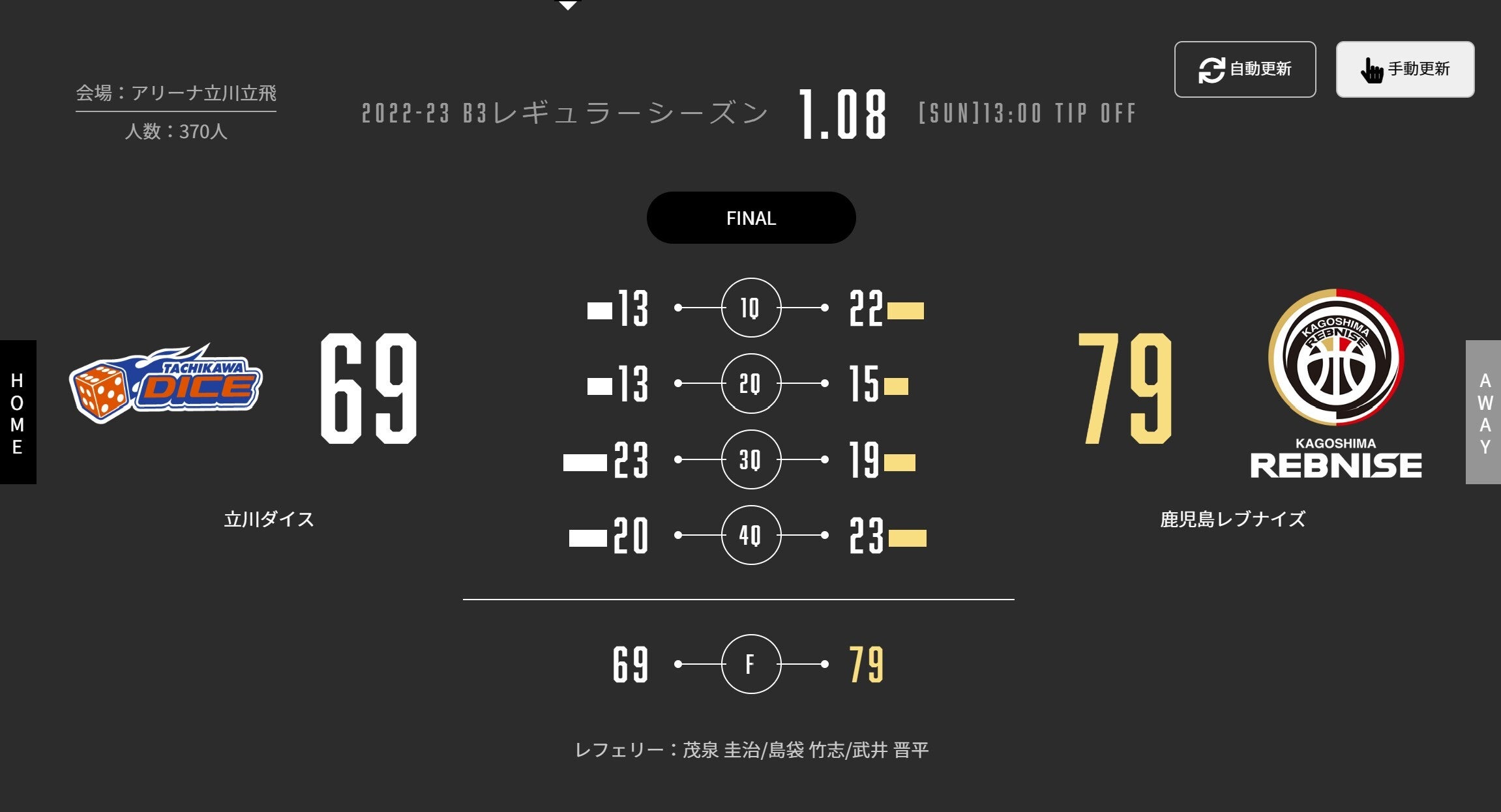 本日(1/8)、B3リーグ 2022-23シーズン 第13節 AWAYアリーナ立川立飛で立川ダイスと対戦しました。試合結果をお知らせします。