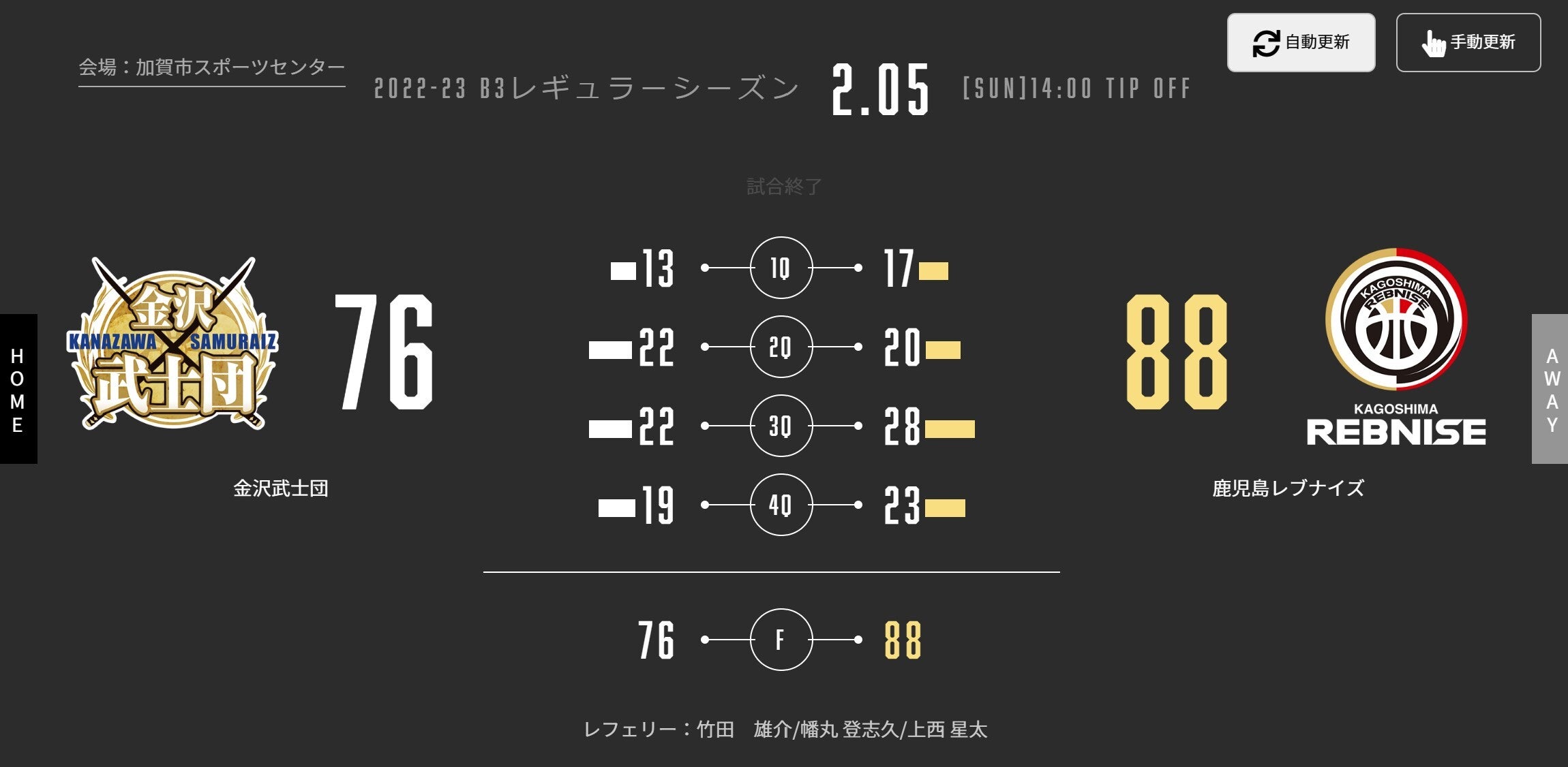 本日(2/5)、B3リーグ 2022-23シーズン 第17節 AWAY 加賀市スポーツセンターで金沢武士団と対戦しました。試合結果をお知らせします。