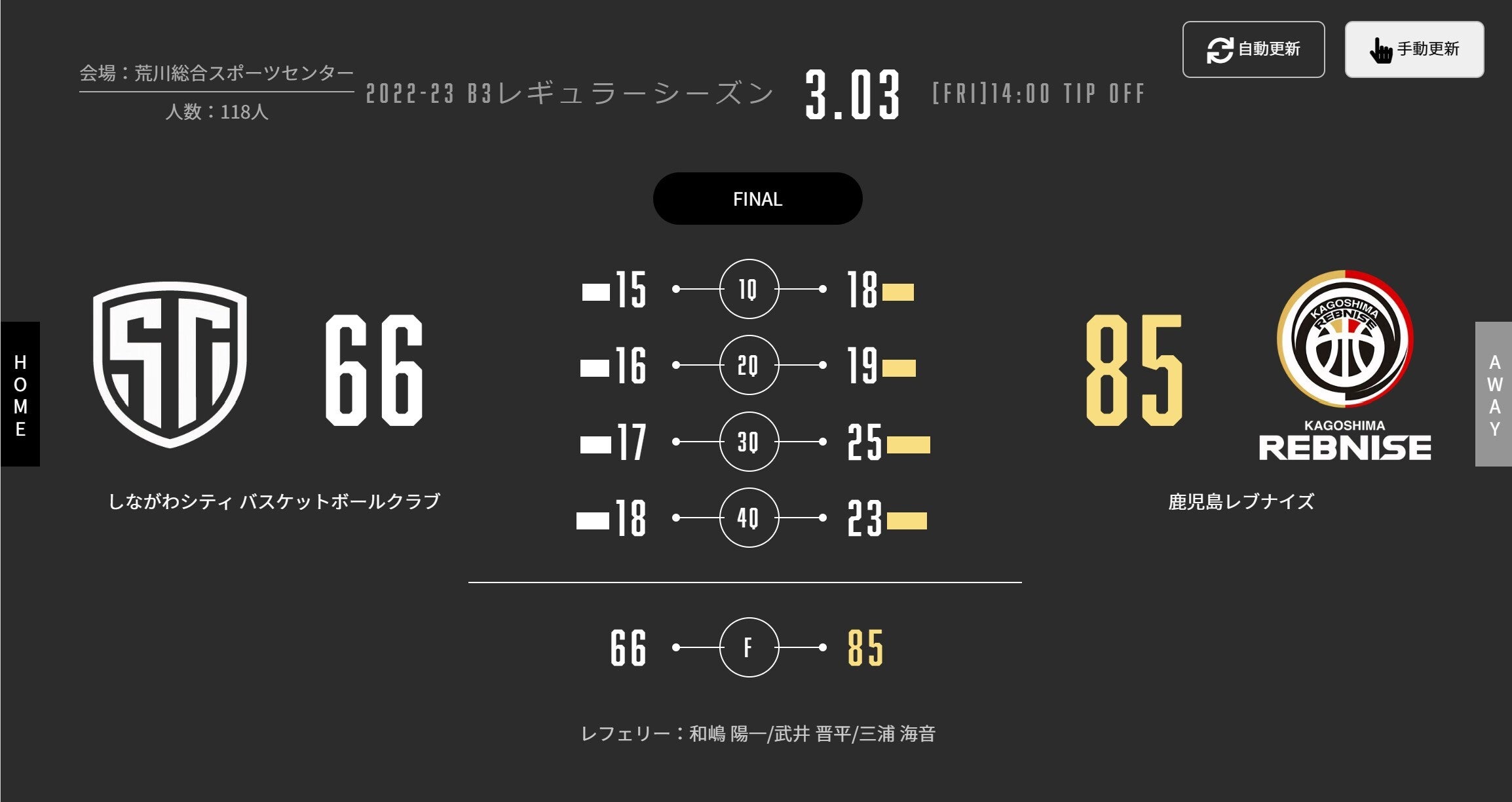 本日(3/3)、B3リーグ 2022-23シーズン 第21節 AWAY荒川総合スポーツセンターでしながわシティバスケットボールクラブと対戦しました。試合結果をお知らせします。