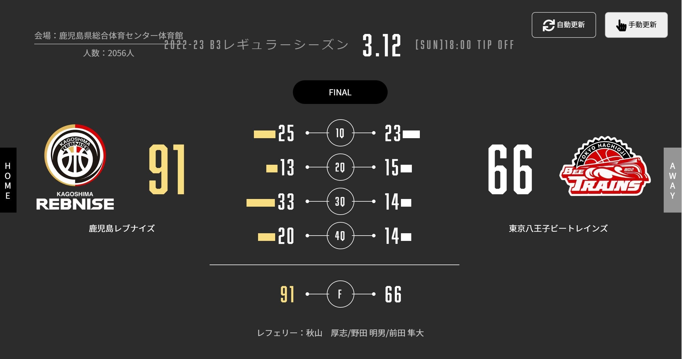 本日(3/12)、B3リーグ 2022-23シーズン 第22節 鹿児島県総合体育センター体育館で東京八王子ビートレインズと対戦しました。試合結果をお知らせします。